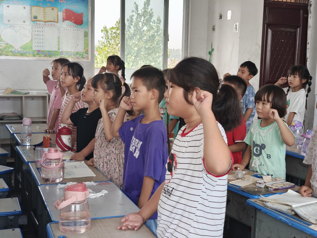 最后,在班主任的带领下,孩子们站得笔直,左手握拳与耳部等高,看着宣誓词大声说出自己的誓言,从今天起,做到光盘,杜绝浪费。