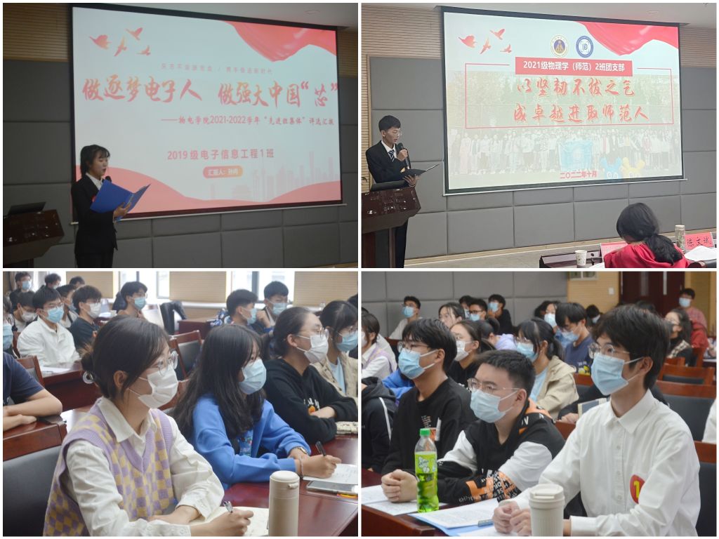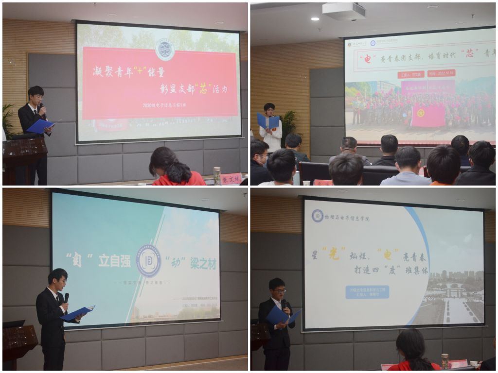 交流会上,11位申报班级、团支部负责人依次上台汇报,利用演示文稿展示了集体在思想引领、组织建设、学风创建、基础文明建设等方面的活动特色和育人成效。电子2019级1班以“芯片”类比,讲述最具创新能量的集成电路图;物理拔尖人才2020级1班围绕“拔尖”这一主题,讲述物理学子在学业、科研、竞赛等方面的创建成果;电子2020级1班团支部以基础团建在精、志愿服务在实、社会实践在行三个角度展示凝心聚力打造的优秀团支部。各参评集体展现出的进取之心、良好氛围、创新举措和成果展示得到了评委老师和学生代表的肯定,也赢得阵阵掌声。
