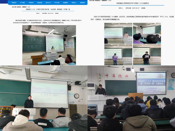 低年级同学结合学校“行走的思政课堂”寒假社会实践暨学院假期“四个一”活动,在班会中开展作品展示、交流研讨,会议气氛热烈,辅导员鼓励同学们要通过社会实践了解社会、了解国情、增长才干、锻炼毅力、增强社会责任感,在社会实践中受教育、长才干、做贡献。