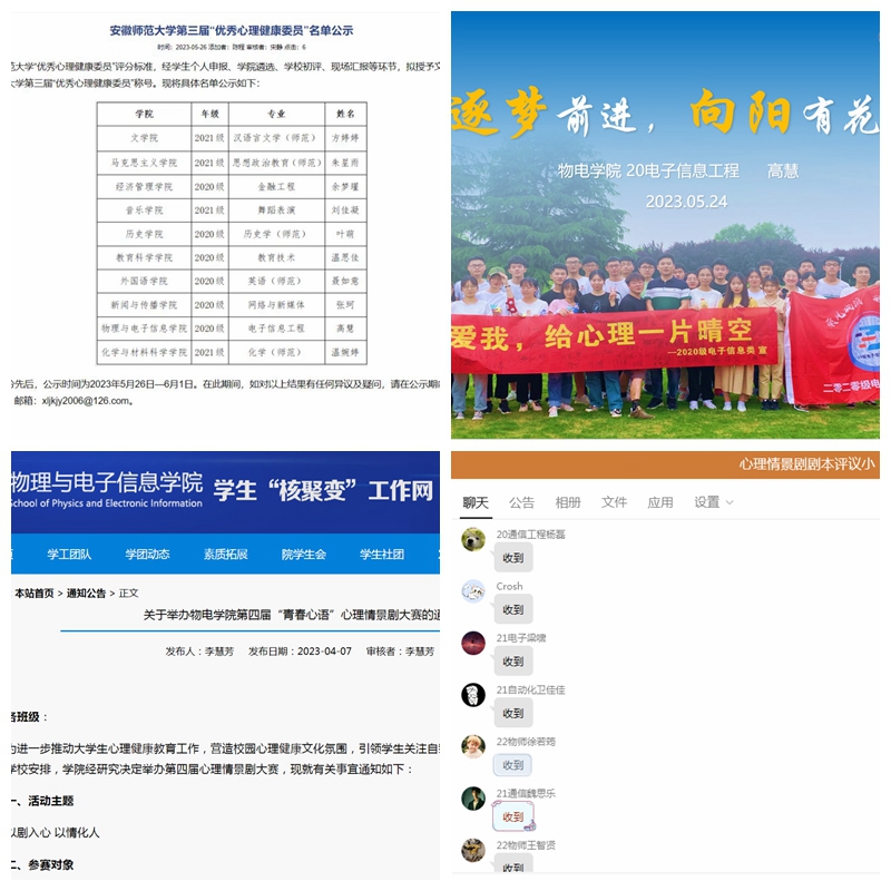 心理健康系列活动开展之初,发展辅导站响应学校心理健康中心第四届“青春心语”心理情景剧大赛和“优秀心理委员”活动号召,积极组织开展院级两项活动。微电影活动中,各班级积极响应,共收集69部心理情景剧剧本,经过学院辅导站老师们和各班级同学代表进一步评议,《以“抱”制暴》作品荣获院级金奖并推送至学校参加评比;优秀心委评选中,我院20级电子信息工程专业心理委员高慧同学以扎实细致的工作内容、真情实感的现场汇报,获得校级十佳“心理委员”称号。