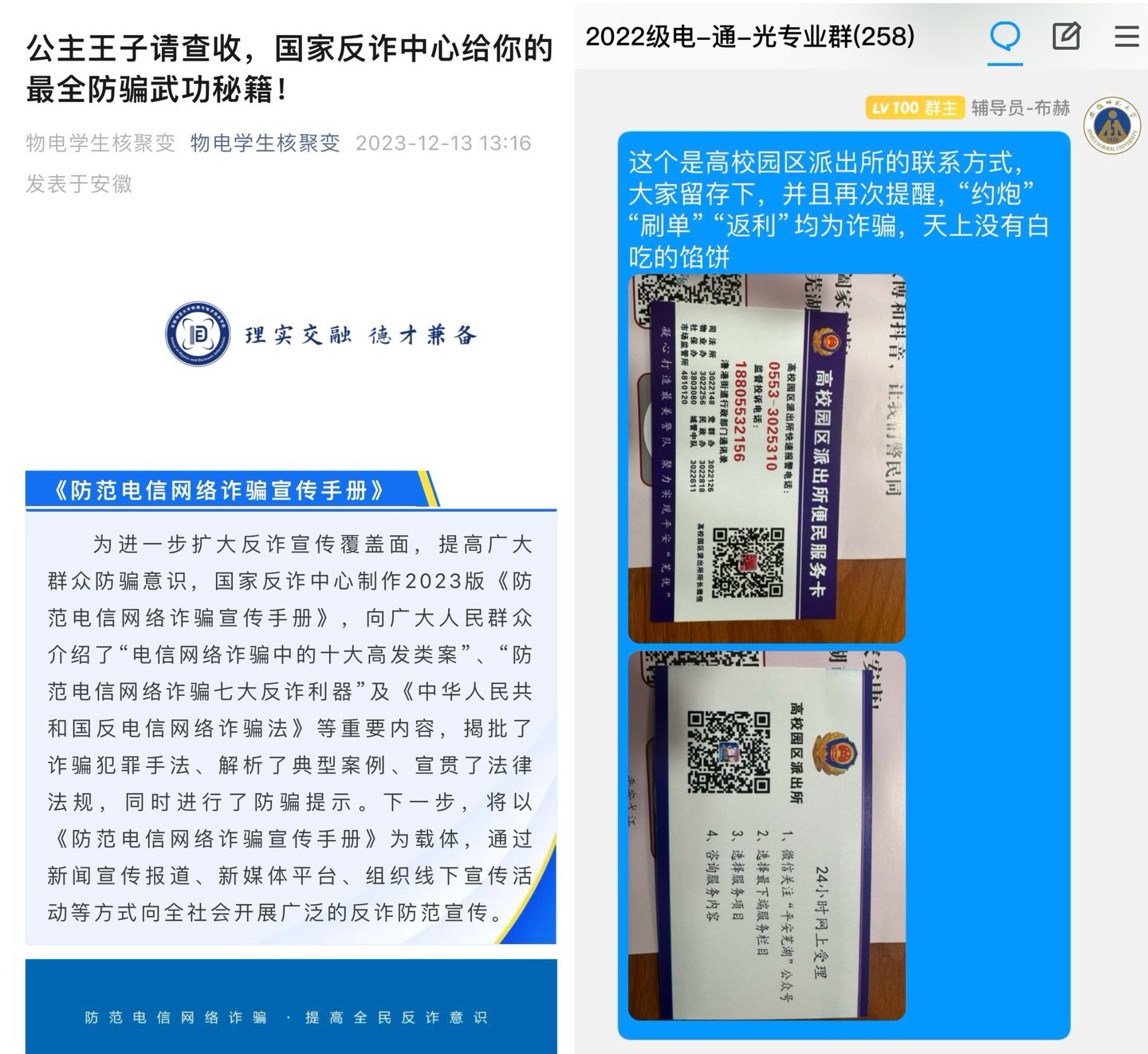 为增强学生防骗意识和防骗能力,学院不断创新反诈宣传教育模式,结合线上线下开展防范电信网络诈骗宣传教育工作。线上微信公众号、班级群推送反电诈宣传教育内容;线下学院精心制作“反电诈”个人责任承诺书,各班级同学通过集体阅读、签订承诺、公示宿舍等形式,做到学院学生全覆盖,共守反电诈安全“责任田”。
