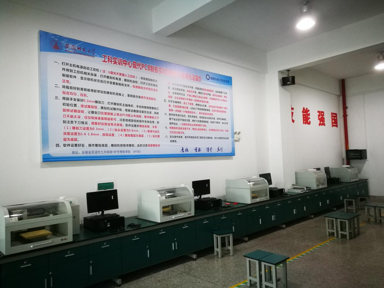 目前,内设金工实训室、课程设计实训室、现代PCB制板实训室、计算机辅助设计实训室、电子装配实训室,毕业实习实训室等。同时,建有材料库、元件库等配套设施。为了体现新工科的教学实践和双创的要求,工科实训中心还内设大学生电子设计训练营,学生在此参与专业学科竞赛、创新创业训练等活动,进一步提升实践、实训水平。