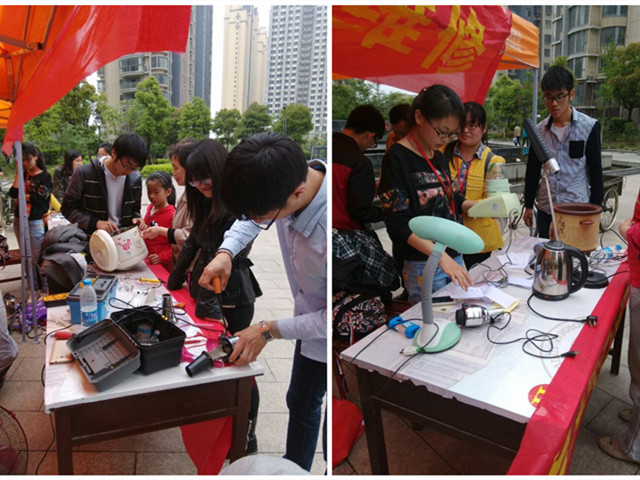 早上9:00,汪老师携电协志愿者们到达文津花园社区。在社区工作人员的积极配合下,志愿者们分工协作,摆桌子,挂条幅,连电线,放工具,一切有条不紊,很快一个简单的家电维修站展现在眼前。维修活动刚开始,就有一个孩子带着他的玩具向志愿者们"求救"。电协工作人员为这个孩子登记后,志愿者们便开始认真维修。紧接着,越来越多的居民带着自家出了问题的家电前来维修。工作人员都将物品一一登记,志愿者们也开始进入紧张的维修工作之中。十点半,吴书记和两位辅导员特地前来指导和慰问大家,让志愿者们心里充满感动,干起活来更加有劲。紧张有序的维修活动进行了3个多小时,共收到40多件维修物品,维修率达到70%。由于时间限制,一些电器没有来的及处理,经居民同意,志愿者们将物品带回电协维修。