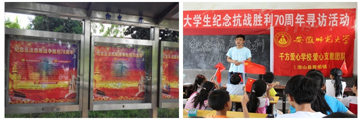 加强宣传,营造纪念氛围;为宣传普及中国人民抗日战争知识,学院精心制作《世界反法西斯战争简史》,以橱窗展出的形式展出,让学生了解世界反法西斯战争知识,特别是中国人民抗日战争史。同时结合暑期社会实践,学院支教团队队员在教育实践基地对中小学生宣传普及纪念世界反法西斯战争胜利70周年相关知识。