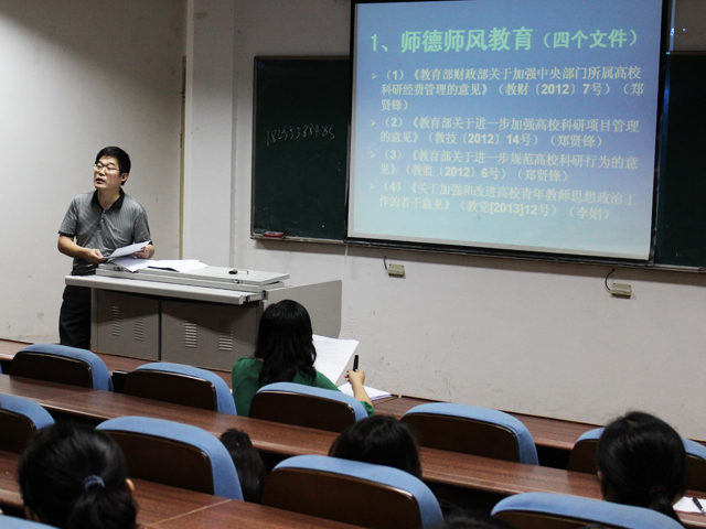 会上,学院副院长郑贤锋带领全体教职工共同学习了教育部加强高校科研经费管理的三个文件,即《教育部 财政部关于加强中央部门所属高校科研经费管理的意见》(教财〔2012〕7号)、《教育部关于进一步加强高校科研项目管理的意见》(教技〔2012〕14号)、《教育部关于进一步规范高校科研行为的意见》(教监〔2012〕6号)。他还结合学院科研管理的现状,对文件中的重要论述进行了解读,并鼓励学院教师积极申报各类科研项目,也希望教师牢固树立法律意识,用好、管好科研经费,规范科研行为。