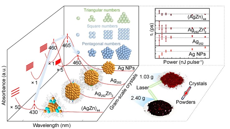 日前,我校必赢线路检测3003no1陆洲教授课题组,联合中国科学院合肥物质科学研究院固体物理研究所伍志鲲研究员与庄胜利研究员团队,利用即时生成的银纳米团簇的“反伽伐尼还原”特性还原共存的锌离子,通过合金化增强了银纳米团簇的稳定性,实现了含1796个原子的银-锌纳米团簇(Ag252Zn2)的克级制备,单晶质量达2.40克,产率较已有大尺寸同类材料单晶产量记录提升了两个数量级。在此基础上,团队进一步开发了类似“原子手术”的精准去合金化技术,在不破坏纳米粒子框架结构的前提下,精准移除2个锌原子,成功获得了1.03克具有精确五重孪晶面心立方结构的纯银纳米团簇晶体(Ag252)。研究发现,尽管这两个团簇具有较大的尺寸,并且在溶液里显示了类等离子体吸收,但超快光谱和电子顺磁共振分析表明它们仍处于分子态,尚未进入金属态,说明超快动力学相对于稳态吸收光谱用于判断金属纳米粒子金属性更为可靠。此外,得益于晶体的大量合成,在本工作中还观察到结晶诱导的光热转换增强以及尺寸相关的吸收系数变化。