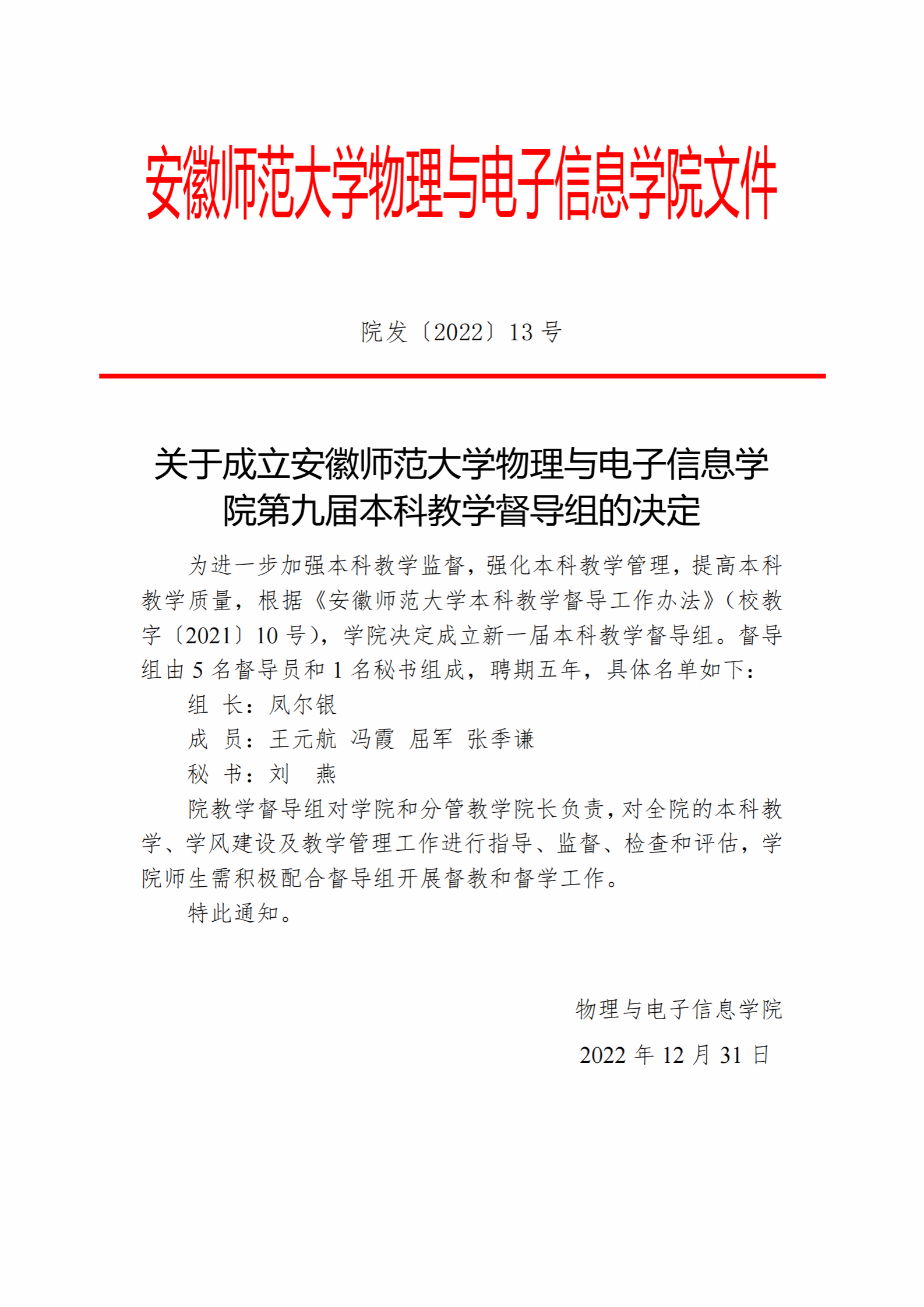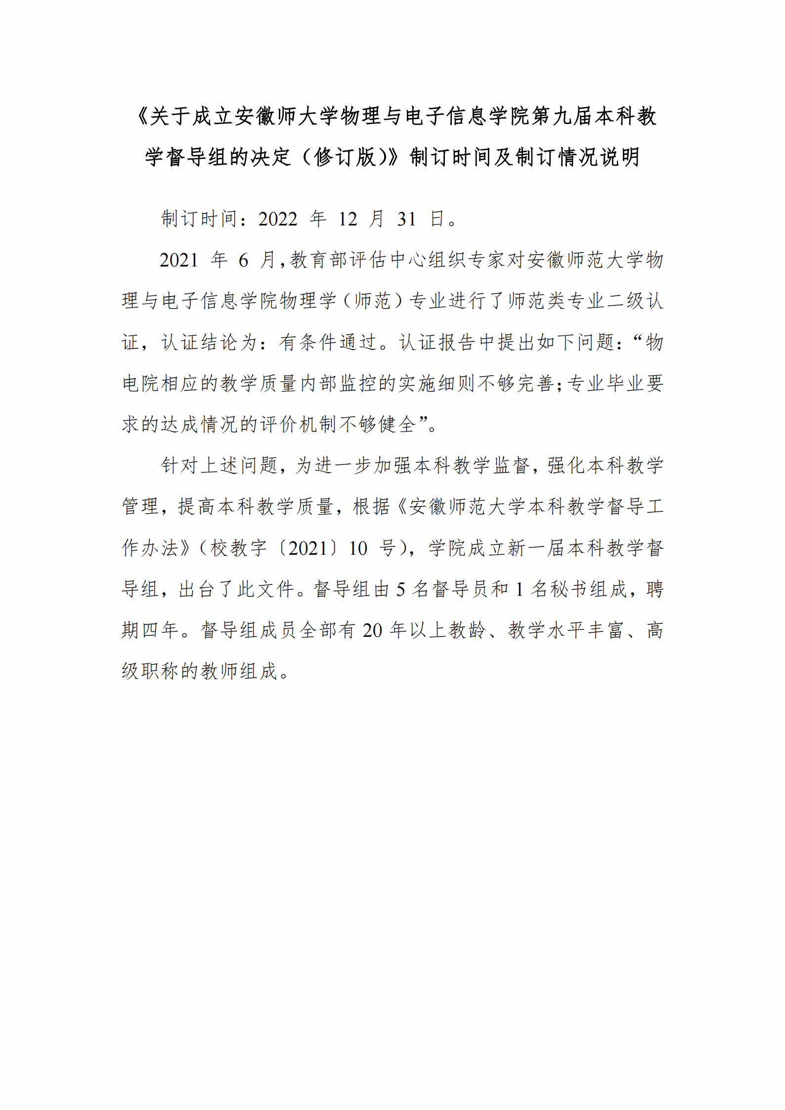《关于成立安徽师大学必赢线路检测3003no1第九届本科教学督导组的决定(修订版)》及制订情况说明